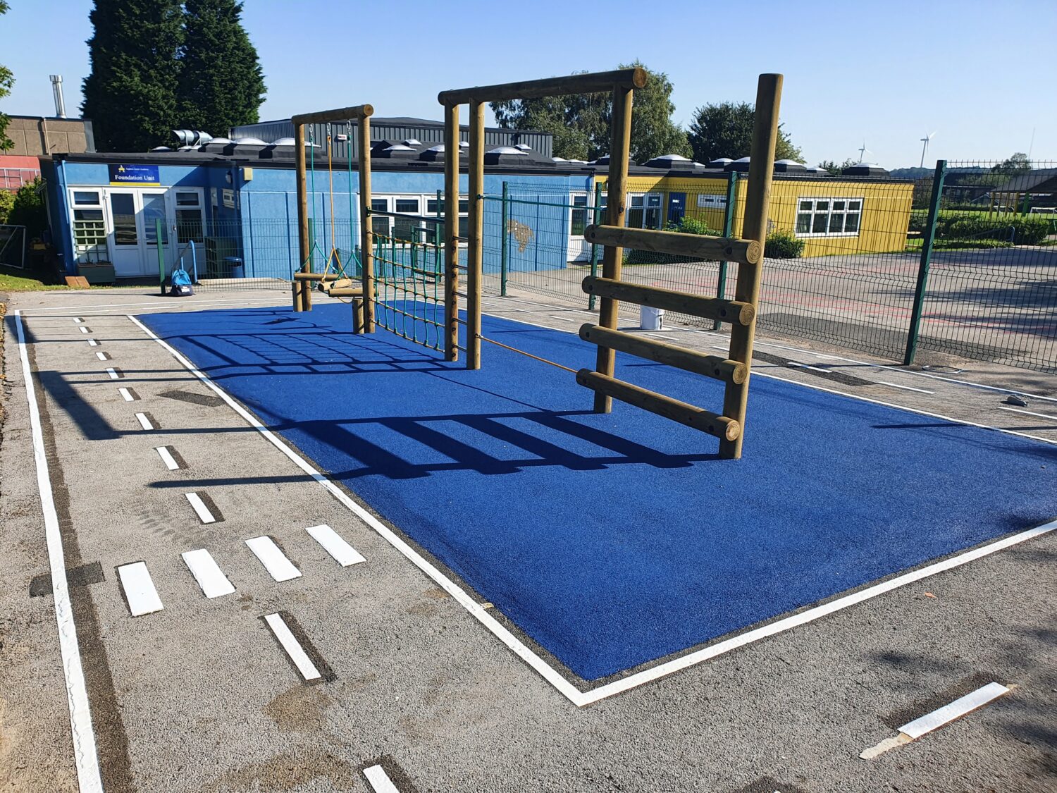 Our team began by installing a wooden trim trail, giving children the perfect opportunity to develop balance, coordination, and confidence through active play. To ensure safety, we then added blue wetpour safety surfacing beneath the equipment. Wetpour is available in a wide range of colours, making it a versatile choice for schools looking to add both safety and vibrancy to their playgrounds.