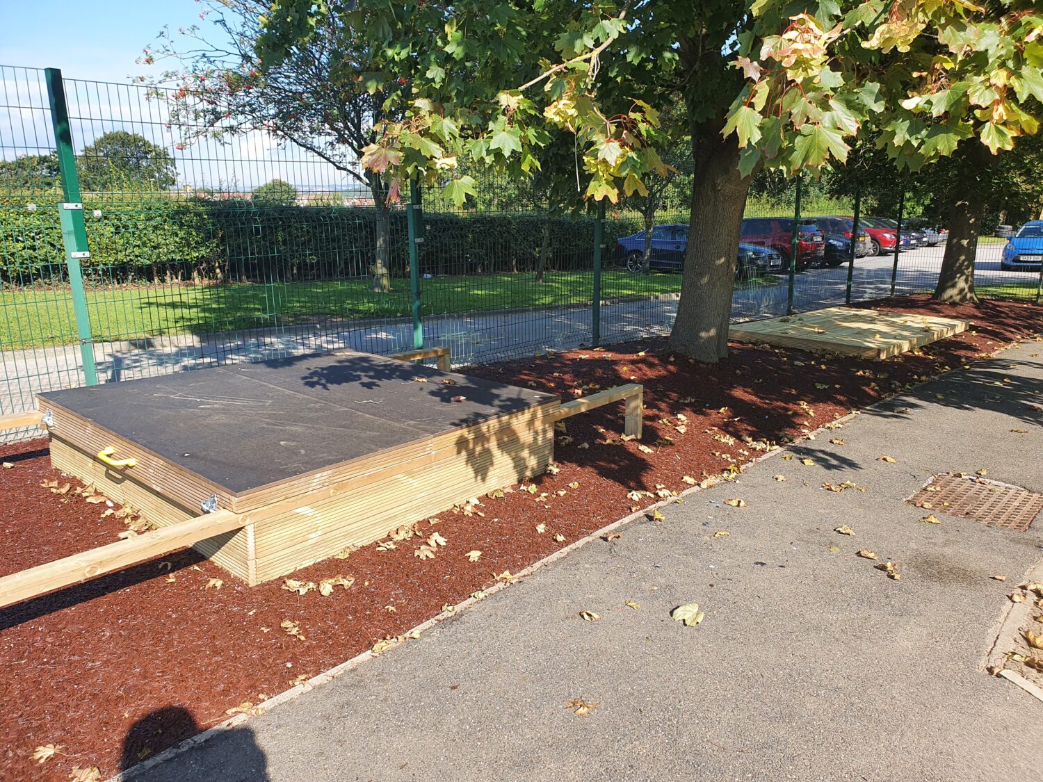 To one side of the playground, we fitted red rubber mulch surfacing, an attractive and impact-absorbing option that blends naturally with timber features. Within this area we also installed a sandpit with a protective lid and a wooden decking stage, offering children a variety of play and learning opportunities.