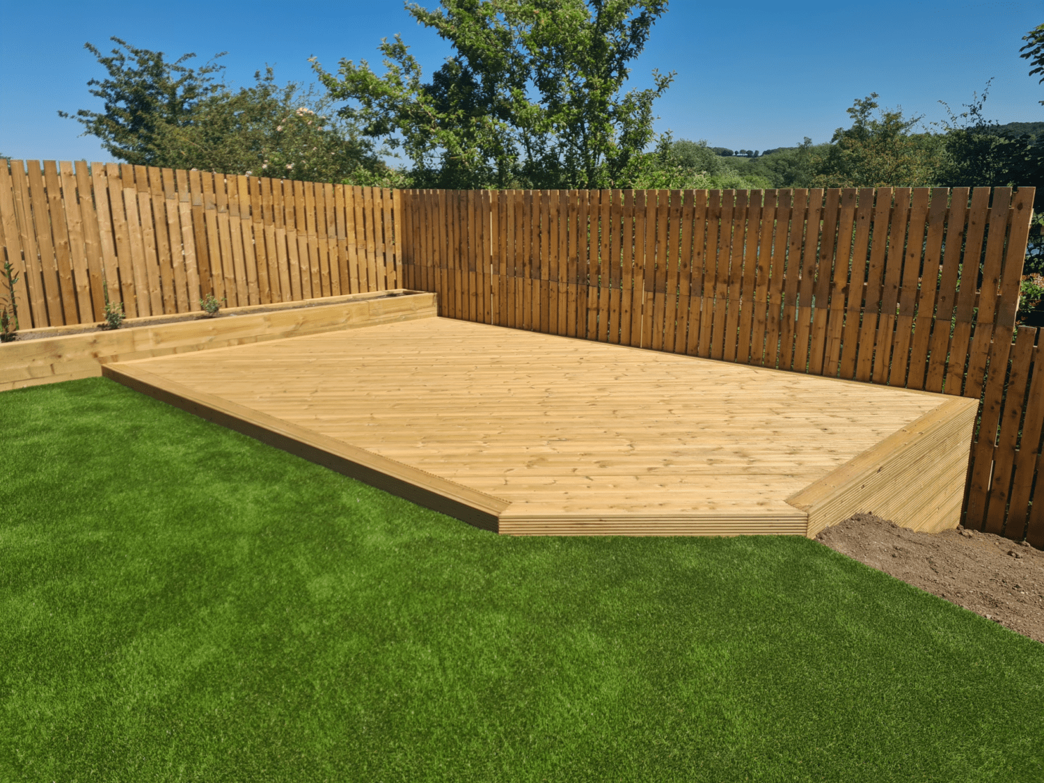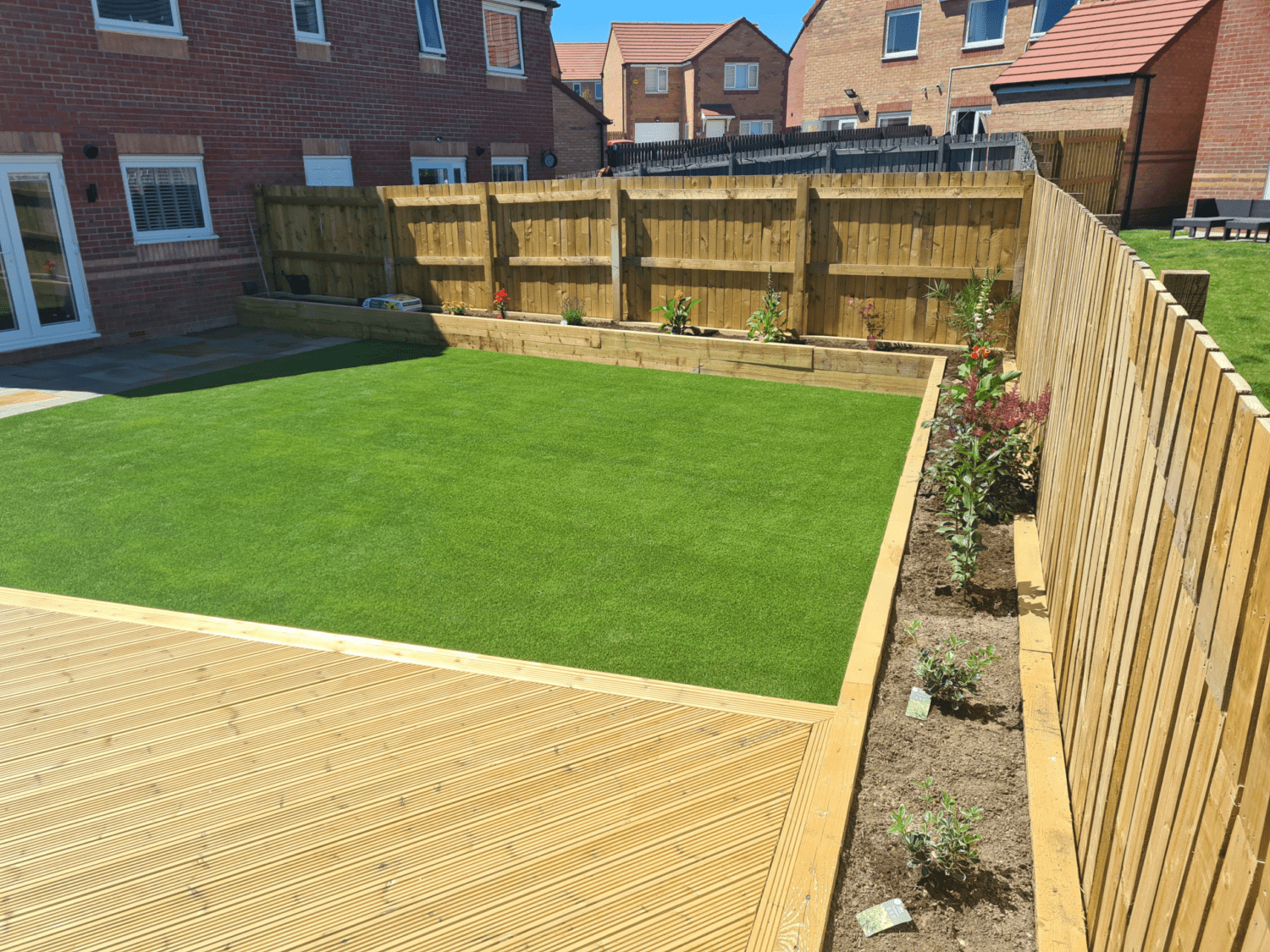 Artificial grass Rotherham installation, with a sleeper planter border, raised decking, and Indian stone