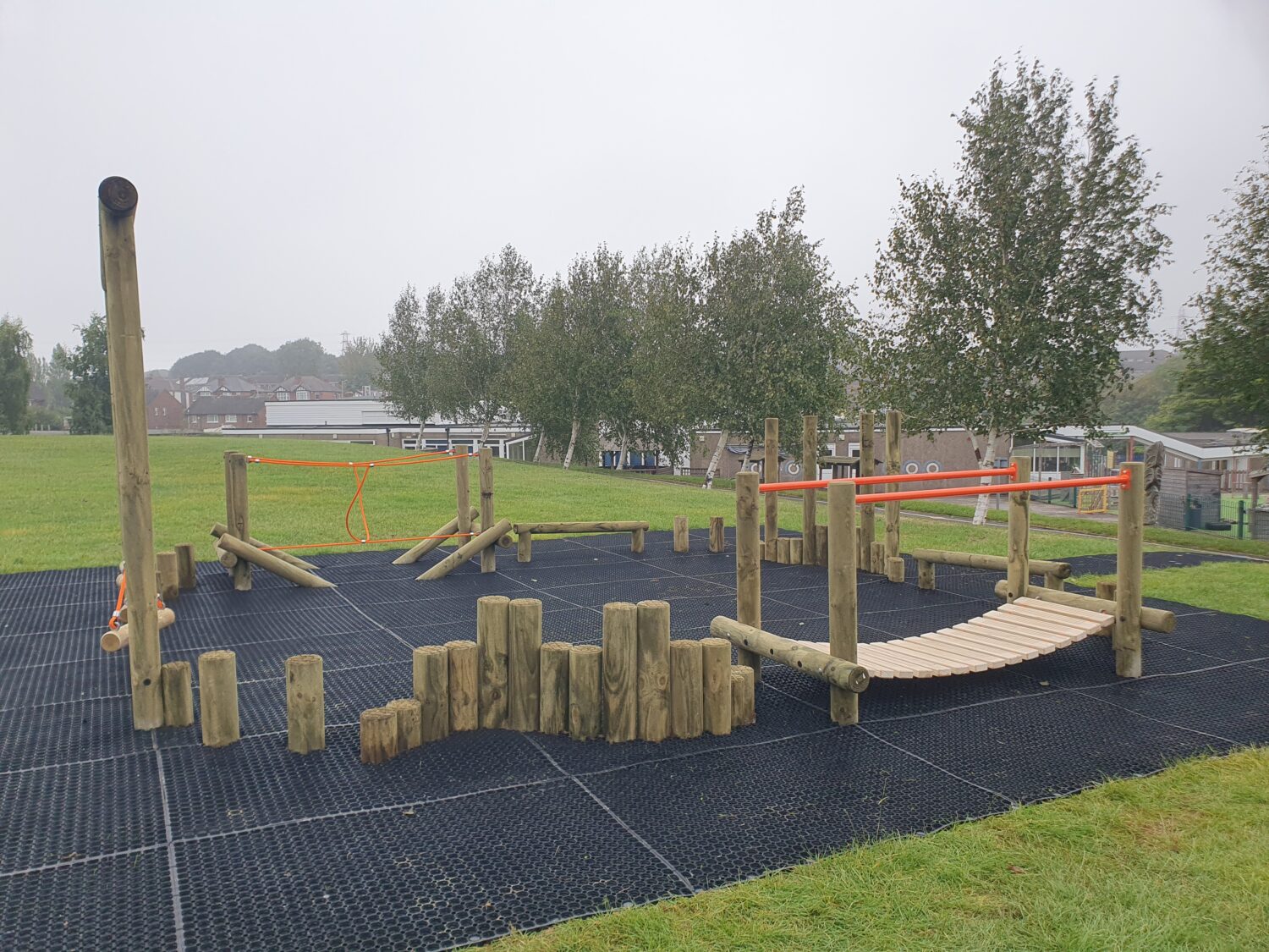 Photo looking out at school wooden playground equipment, featuring a timber trim trail and tangle climber installed on artificial turf safety surfacing, and a bespoke lookout tower over looking a river on play bark