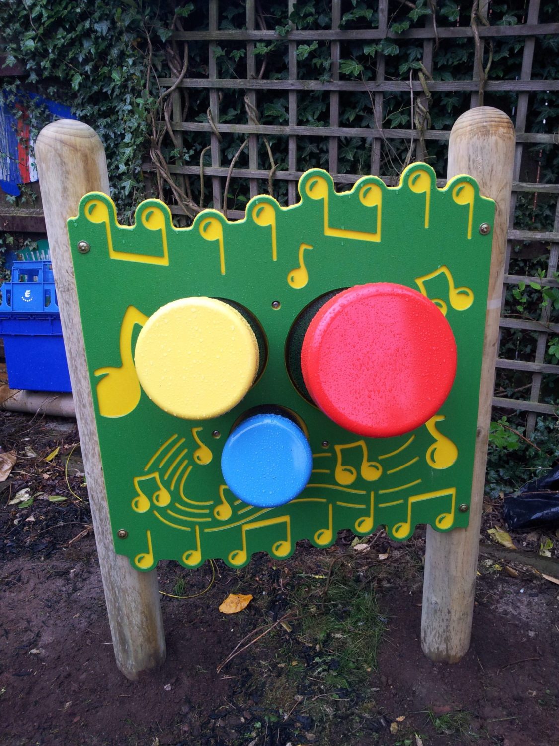 A bongo drums play panel with the bongos set at angles and in 3 different sizes to create different tones. Two coloured panel with other colours available.