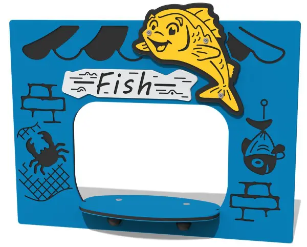 A HDPE fish shop play panel complete with a window opening and countertop, perfect for imagination and role play.