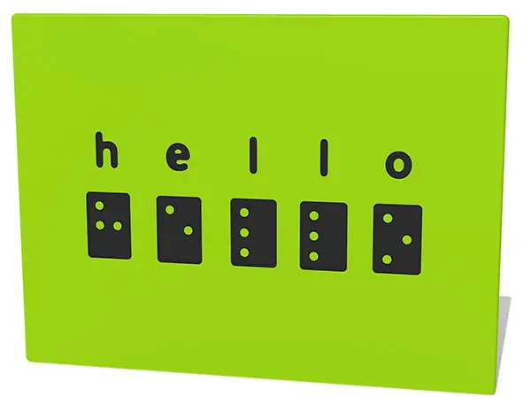 An inclusive “hello” in braille HDPE play panel, in two colours with engraved text and braille.