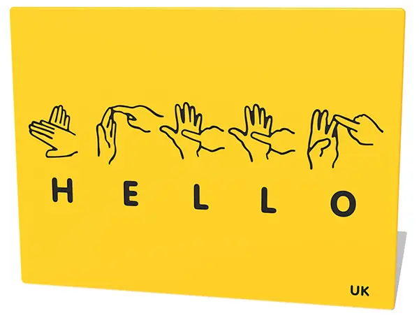 An inclusive “hello” to help children learn how to say it in sign language, HDPE play panel, in two colours with engraved text.