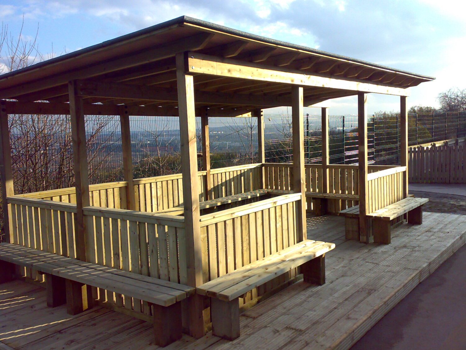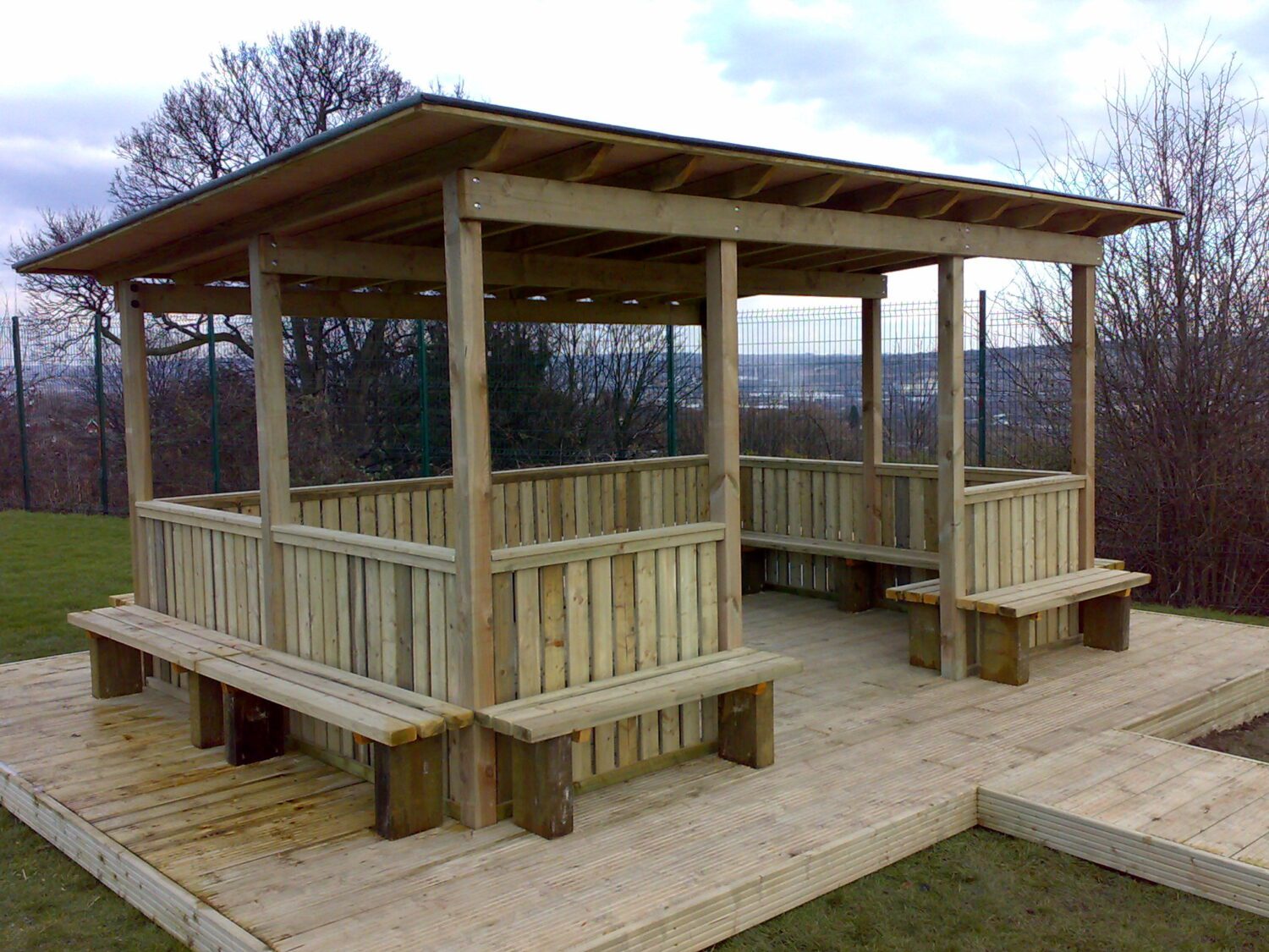 A spacious timber outdoor classroom with pergola-style roof, boarded and felt covering, hit-and-miss fencing, and built-in seating inside and out. Available free-standing or with a base.