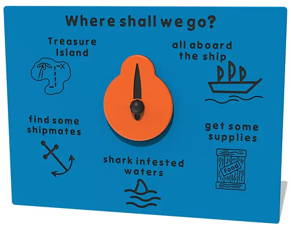 An addition pirate themed HDPE play panel to compliment pirate play panels, complete with a spinning pointer to determine where to go, perfect for imagination and role play.